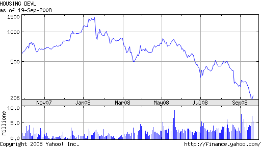 This past week the equity markets were not kind to the Indian real estate sector including some of the companies I track. HDIL (down 87% from peak, click the above image for a chart), Orbit (-83%), Parsvnath (-84%) and Sobha (-82%) are all near their all-time lows, of course most have only recently listed on the exchanges. HDIL is the Bombay based property kingpins run by the Wadhwan family. This research report from ENAM covers HDIL, the report is good if you want a macro view on the Bombay real estate market. ENAM had a price target of Rs. 712 when it published the report on Aug 18, 2008, on Sept 26, HDIL closed at Rs 190.35. I might be a bit jealous of HDIL as they have one of the largest collection of sweet rides in Bombay, most notably the Rolls Royce Drop Head Coupe.