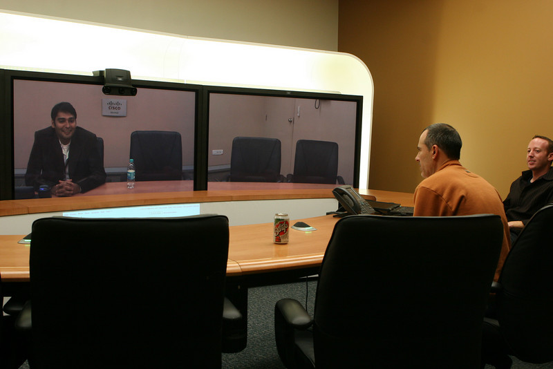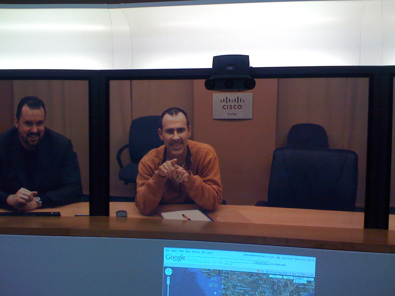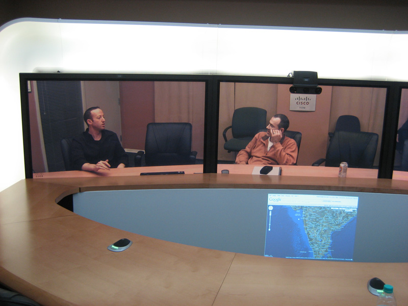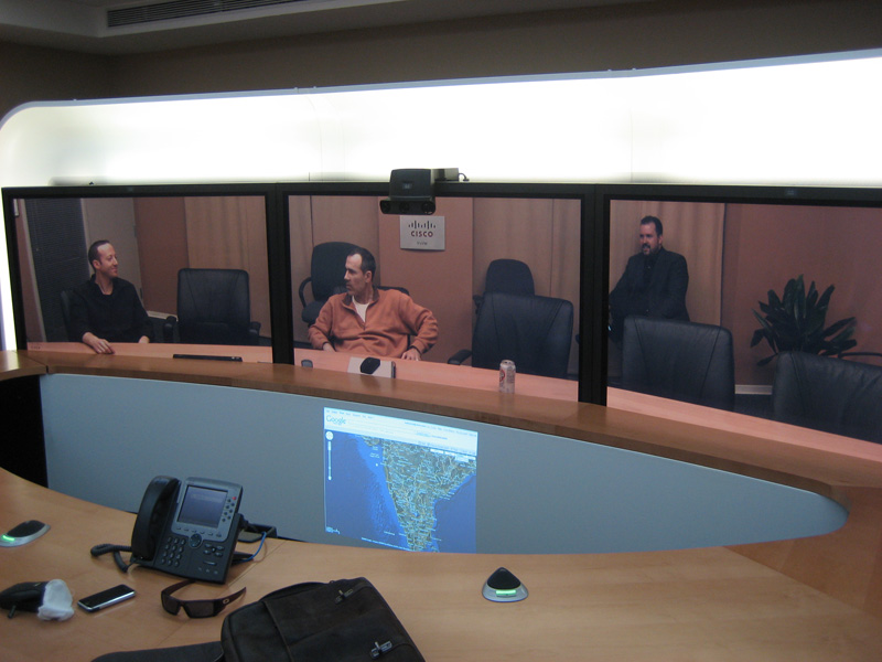 The Cisco team built TelePresence from the ground up and went as far as designing the room, chairs and table that need to be used. The unit I was using cost around USD 300k per side and had three 65″ LCD’s running full 1080p…yes 1920 x 1080. That means several gig’s of data was compressed to under 15Mbps which is still a lot of bandwidth but it is so worth it. Below are some pictures but they really don’t do justice, first 5 pics are from Bombay and the last 2 are from Irvine. I really should have taken a video!