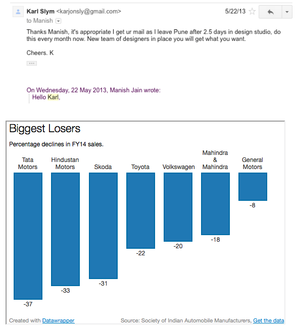 After that fiasco, Tata Motors got their act together and hired an outsider to run the show. They found Karl Slym who was previously heading up the Indian operations for General Motors. Karl was supposed to clean up the mess and get Tata Motors back on track. Although he was juggling many balls, in the press he talked at great length about streamlining and optimizing the number of vendors they buy parts from. I dropped an email to Karl and mentioned: