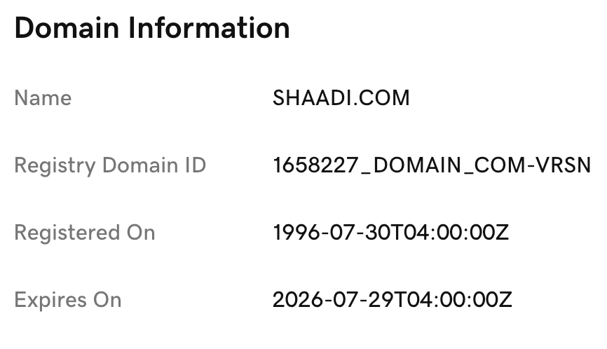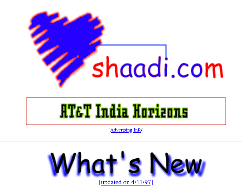 Version 1 of shaadi.com was officially launched on October 1, 1996 – you can check out an archived copy of it. (If you look closely at the bottom of the page, you’ll see we used keyword stacking to get ranked higher in search engines like AltaVista, Lycos, etc. This was years before Google and their PageRank algorithm which killed that technique to game the search engines.)