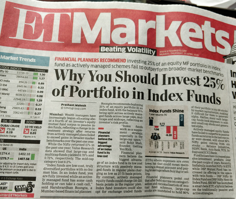 I must say, I was pleased to see the headline in the Economic Times talking about investing in index funds (article link). And really shocked they mentioned an allocation of 25% to passive index funds. When people ask me for investment advice, I usually roll out the passive index fund speech and literally with 14 seconds people just tune out. Why? Because passive index funds (or ETFs) are boring to talk about.