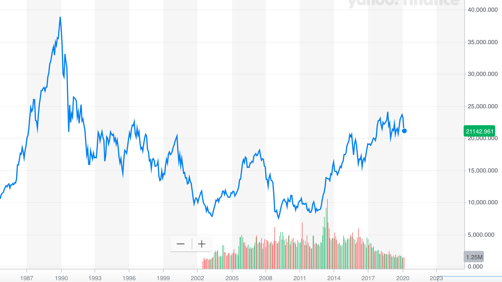 On the flipside, I present the following chart of Japan’s Nikkei index level. If you look closely, the market hit a peak on Dec. 29, 1989 and finished the year at an all-time high of 38,916. It has NEVER returned to those levels. As of March 5, 2020 it’s trading at 20,750.