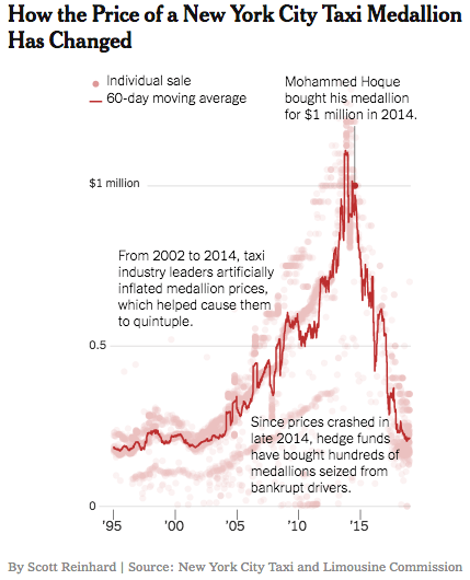 Guess what? That never happened. Instead the prices hit historical highs even though Uber was all over NYC. What was reason? Subprime lending to taxi medallion owners who mainly were immigrants. When the bottom finally felt out, the market for medallions crashed.