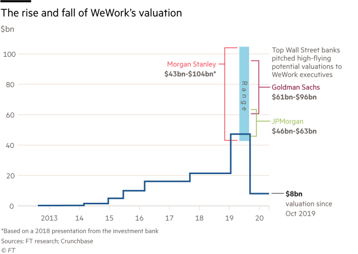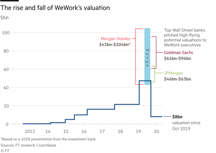I just came across the WeWork valuation chart. Look at the valuation estimates from Morgan, Goldman and JPMorgan…they all were going to be part of the IPO offer and were incentivized to ratchet up the price.