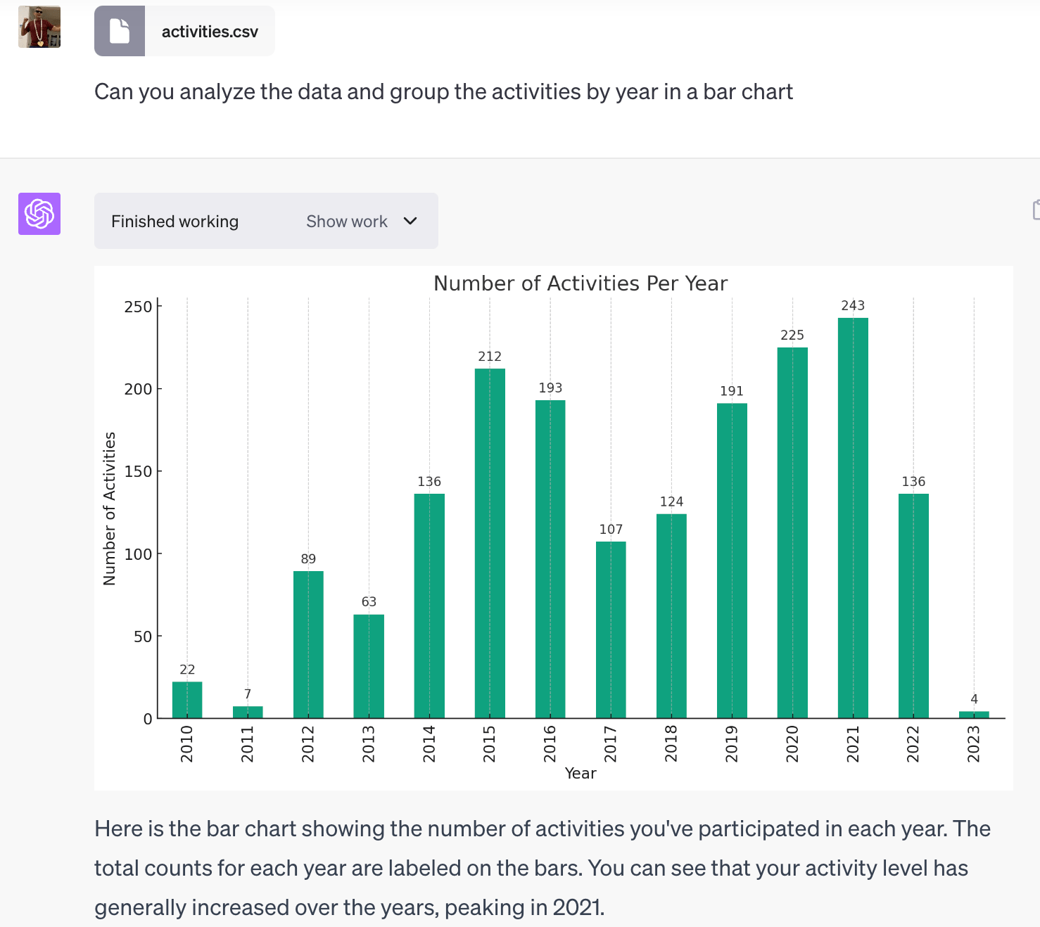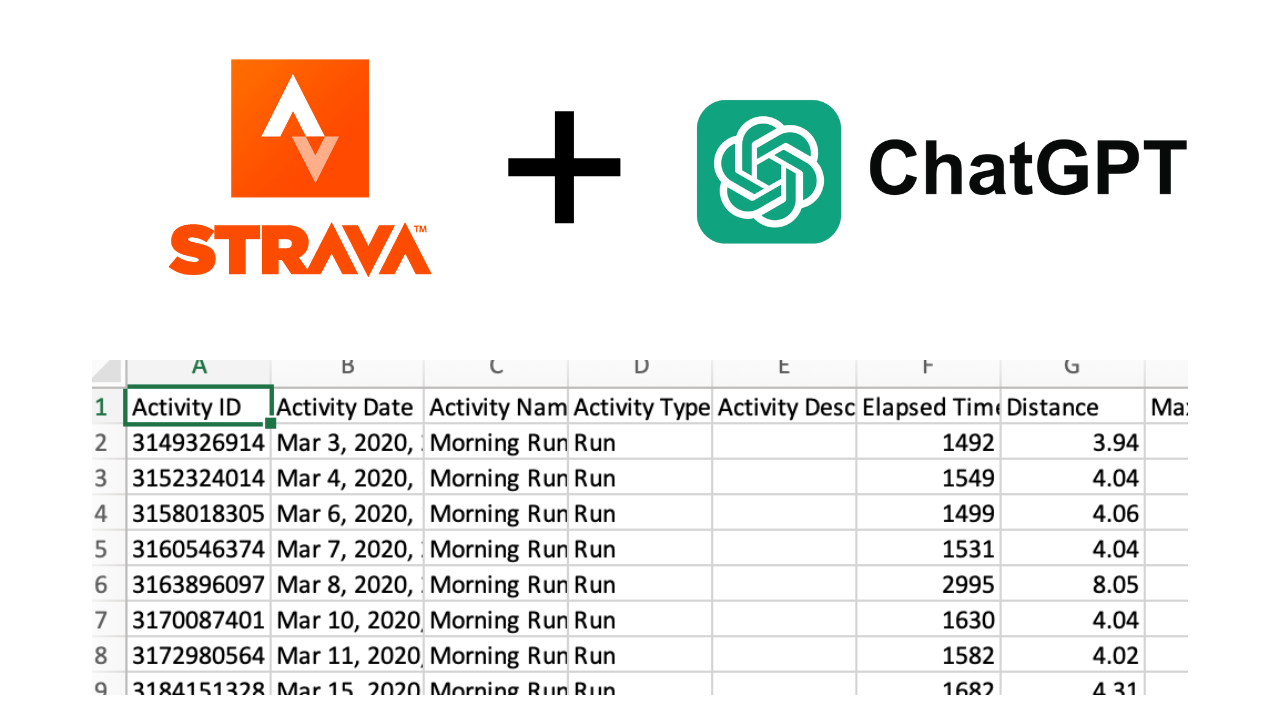 If you are a Strava user, visit this link to find out how to download your data. Once you download the data, unzip it and then look for the activities.csv file and upload it to ChatGPT and run with it!