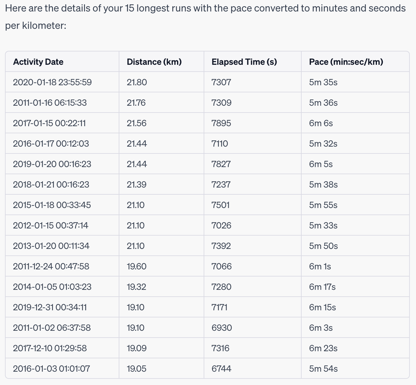 Back to ChatGPT and my Strava data, next I asked for my 15 longest runs which would capture all the Mumbai half-marathons that I have run.