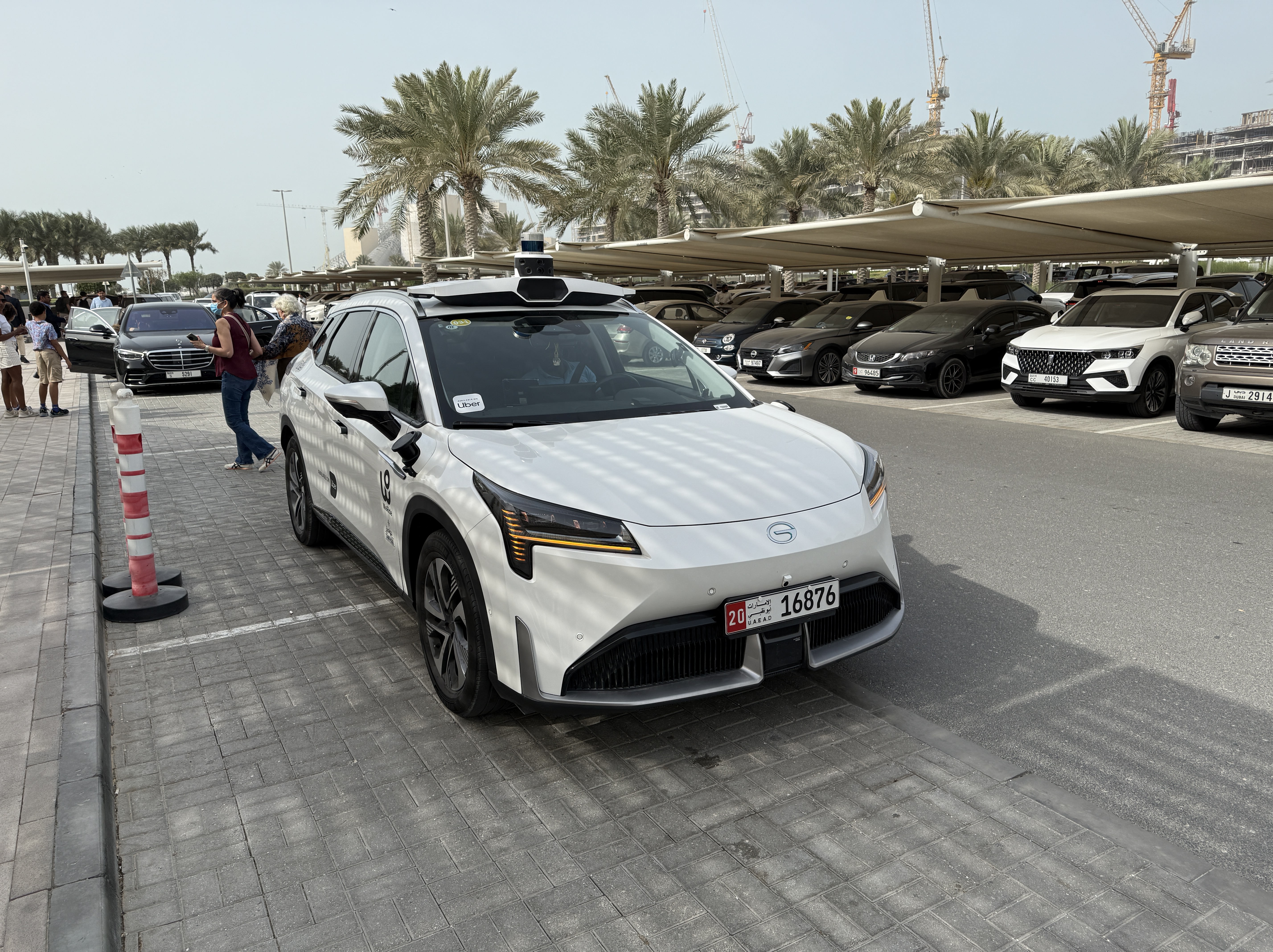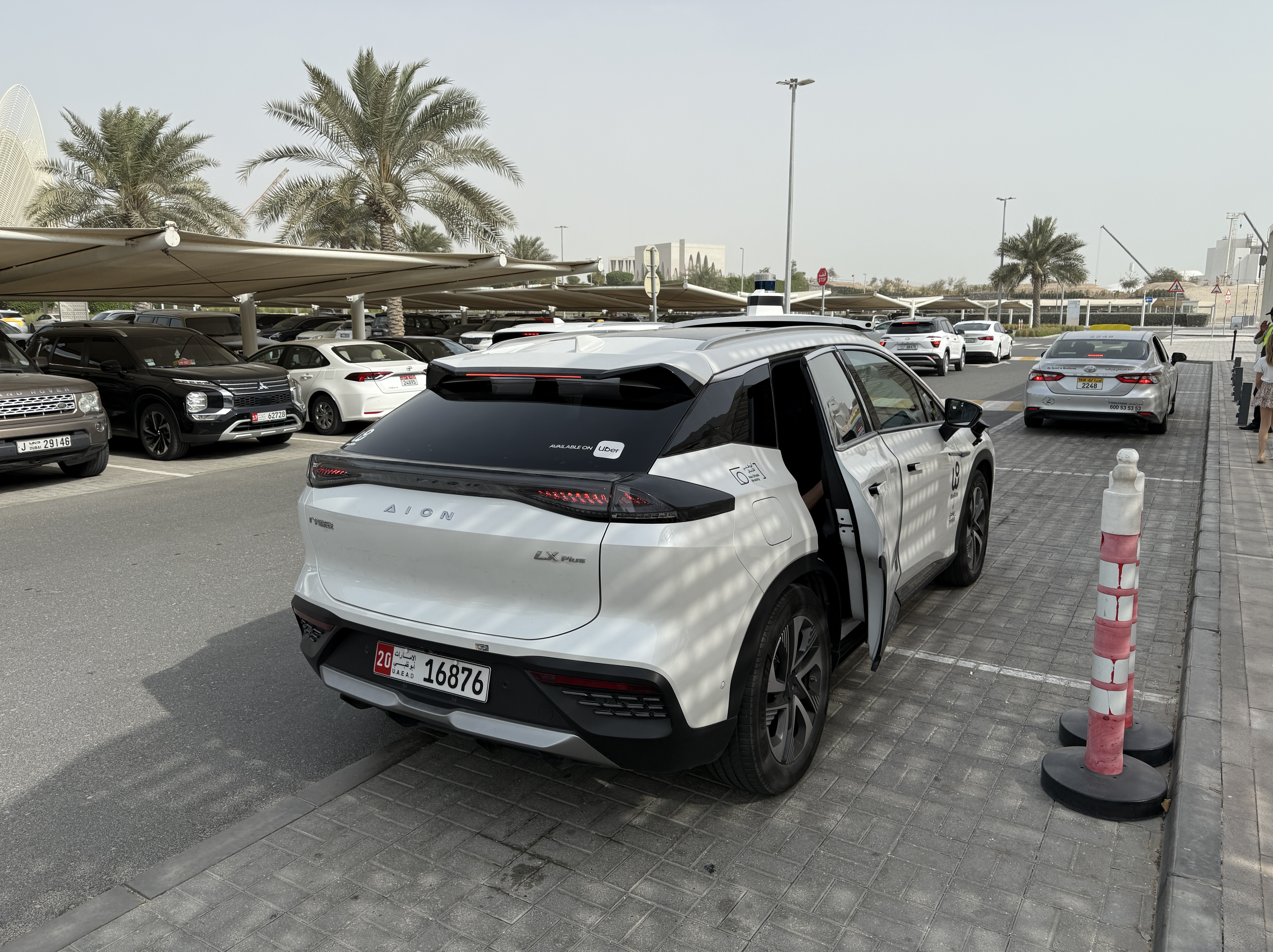 A sleek vehicle from GAC Aion, a Chinese EV brand, drove up. The car was equipped with an array of cameras and LIDAR sensors. GAC Aion has partnered with WeRide, a company that provides autonomous driving technology. In turn, WeRide has collaborated with Uber to introduce these autonomous vehicles to the UAE market—initially starting with Abu Dhabi.