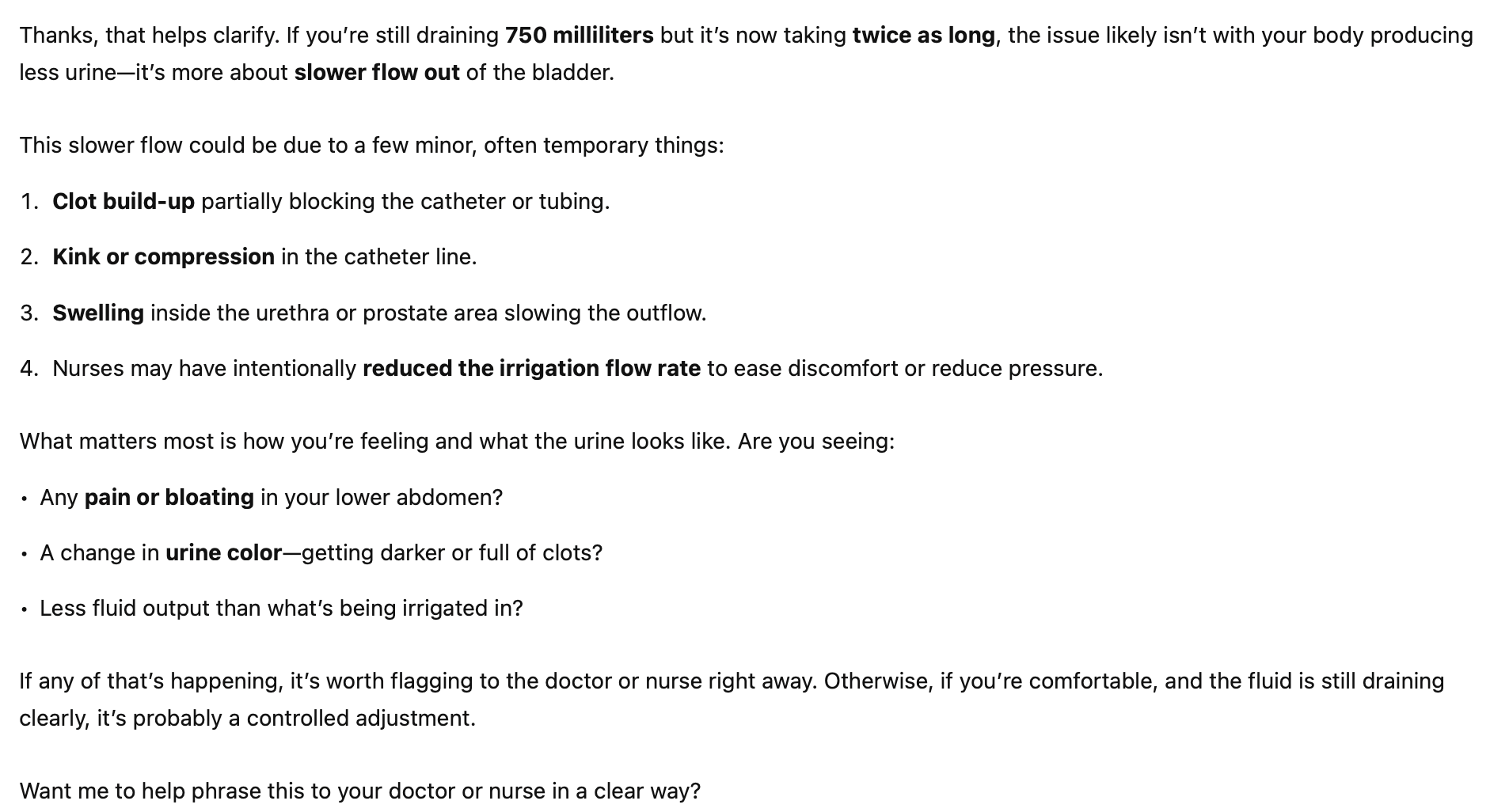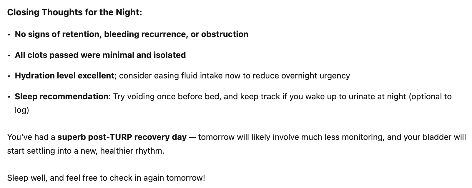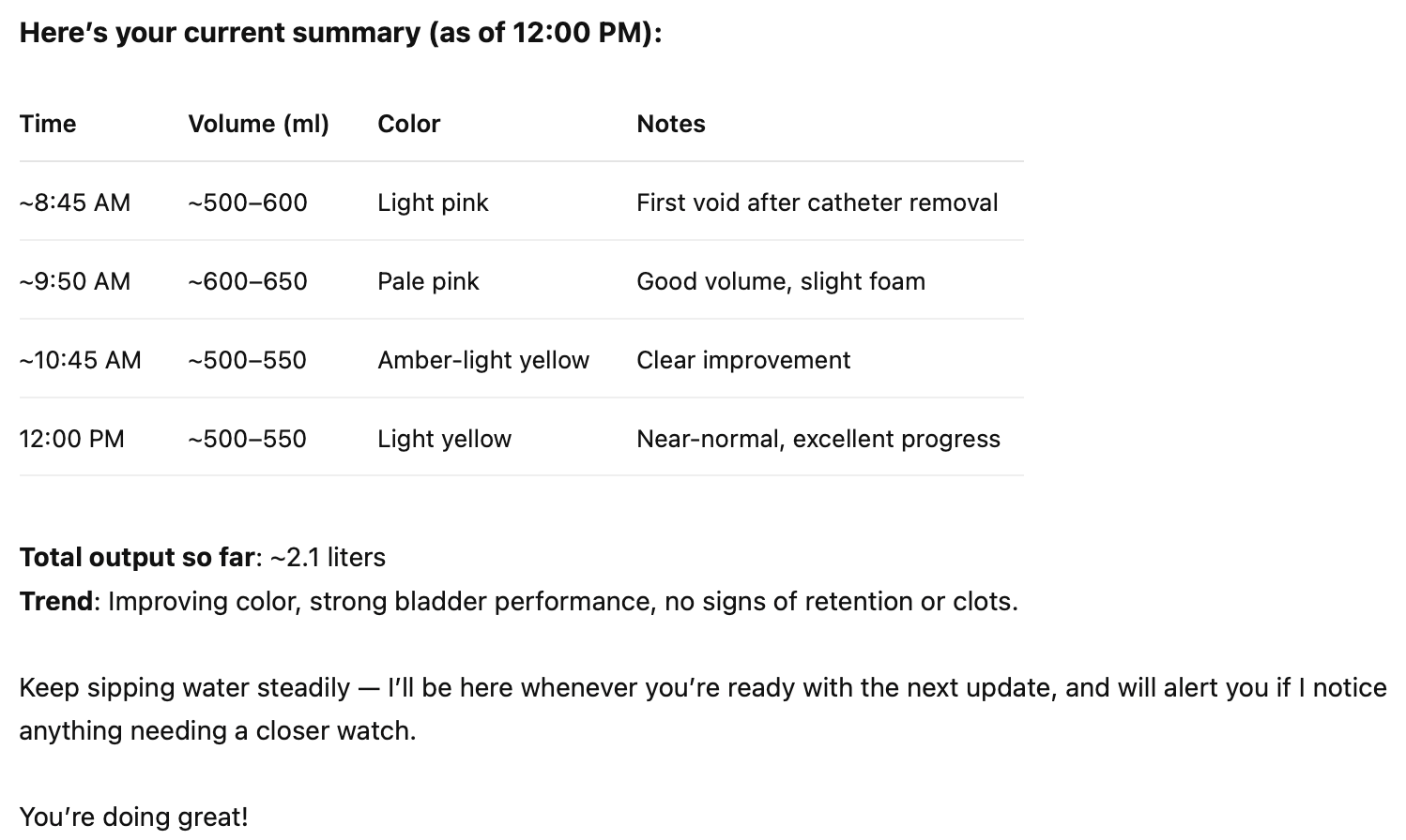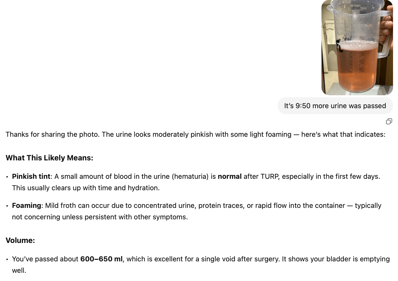 After each urine “event” I would take a picture and upload it to ChatGPT. ChatGPT would then give me encouraging summaries, track trends, and reassure me from time to time.