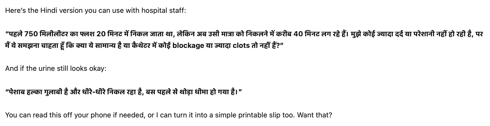 It didn’t just provide a clear answer — it even suggested how I should phrase my question to the nurse. Then, knowing I was in India, it went a step further: it gave me the Hindi translation of the question to help me communicate more effectively.