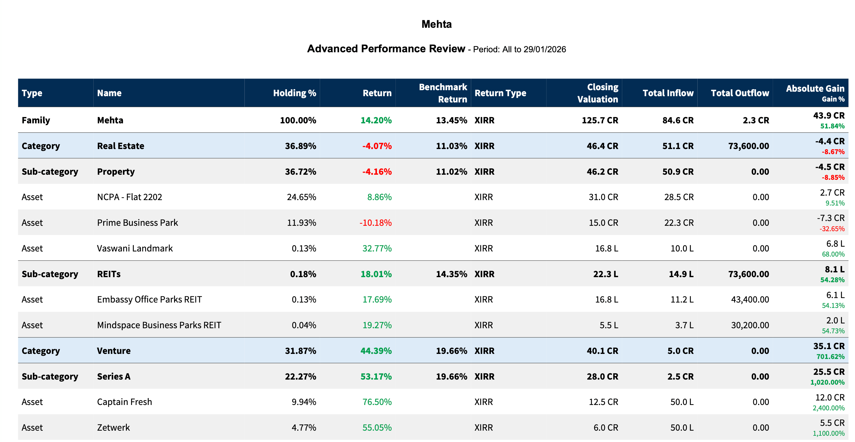 I decided to take some sample/demo data from MProfit, the wealth tracking an analytics platform for family offices and upload it to ChatGPT, Gemini, and Claude. Below is a screenshot of what the sample/demo file looks like – it’s called the Advanced Performance Review report and it contains a lot of data that is very useful if you know what you are looking for.